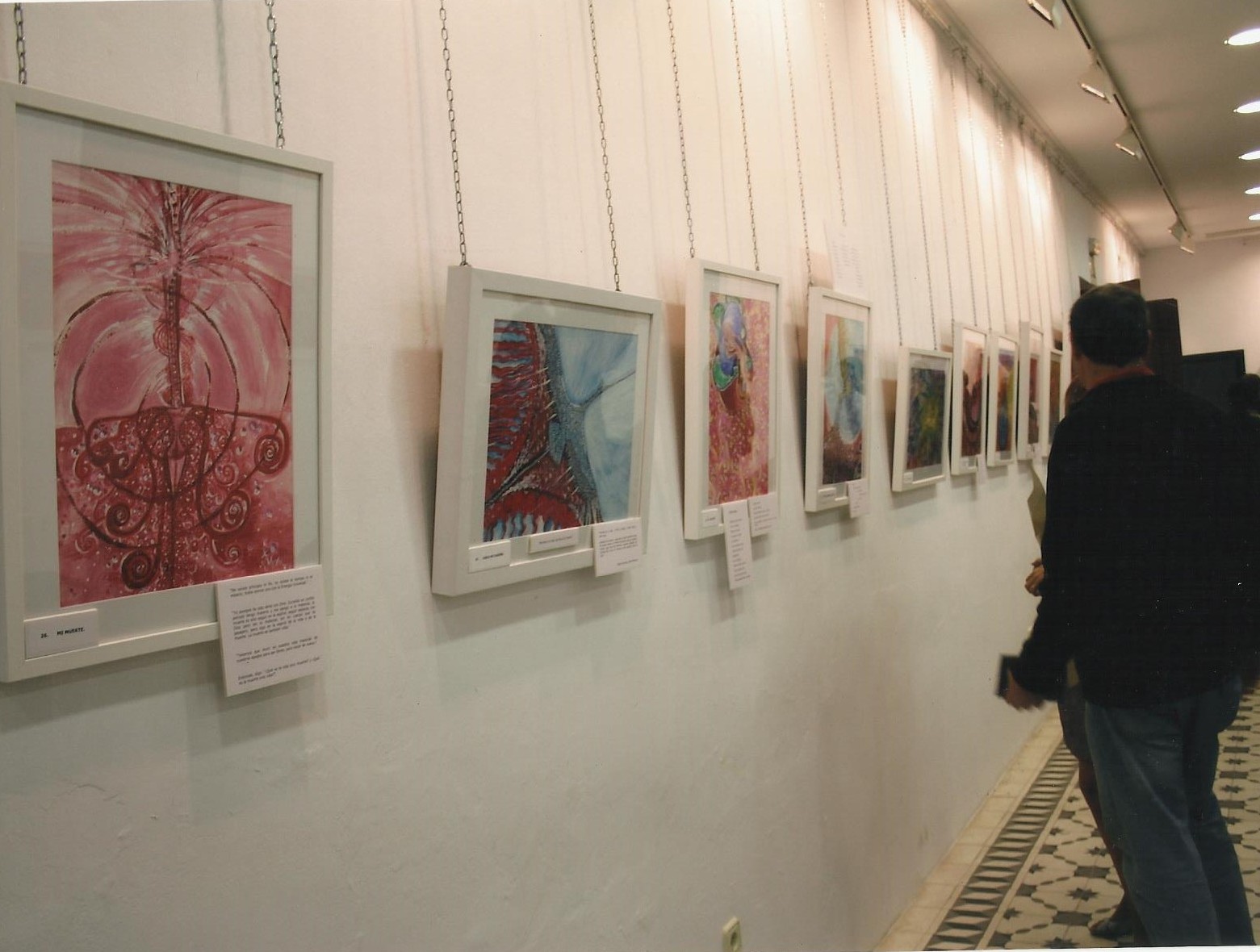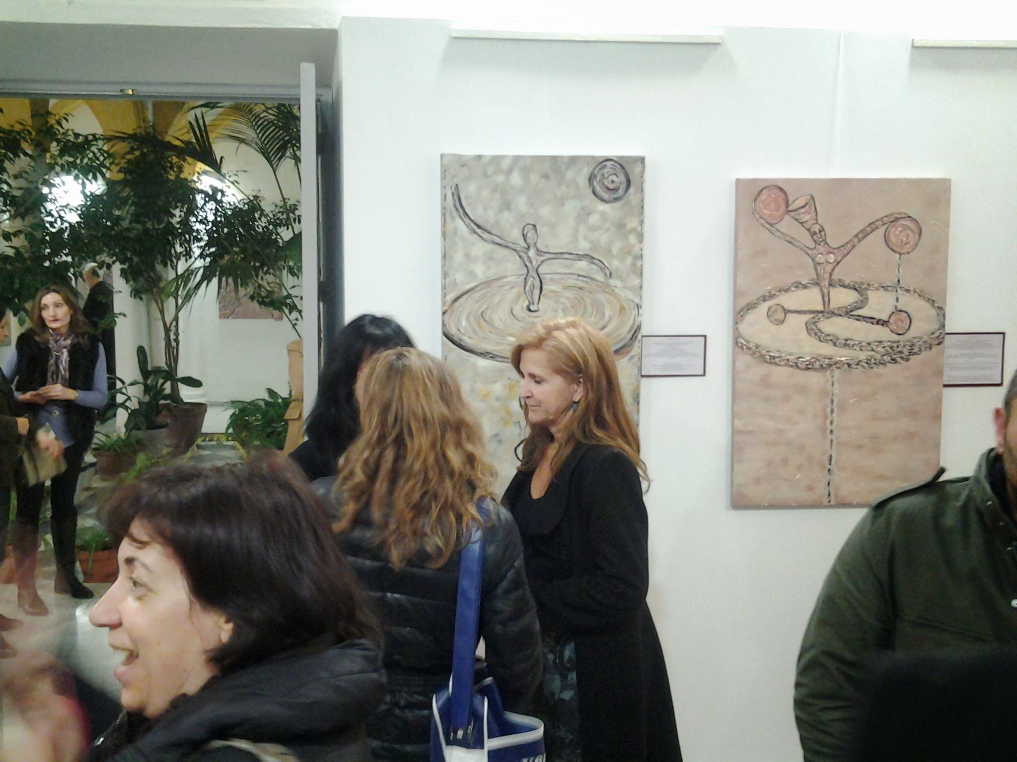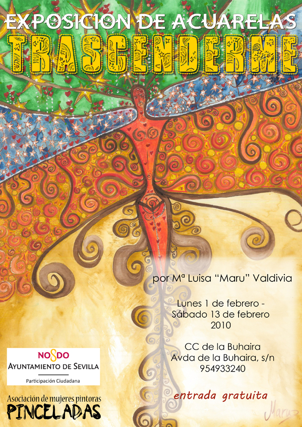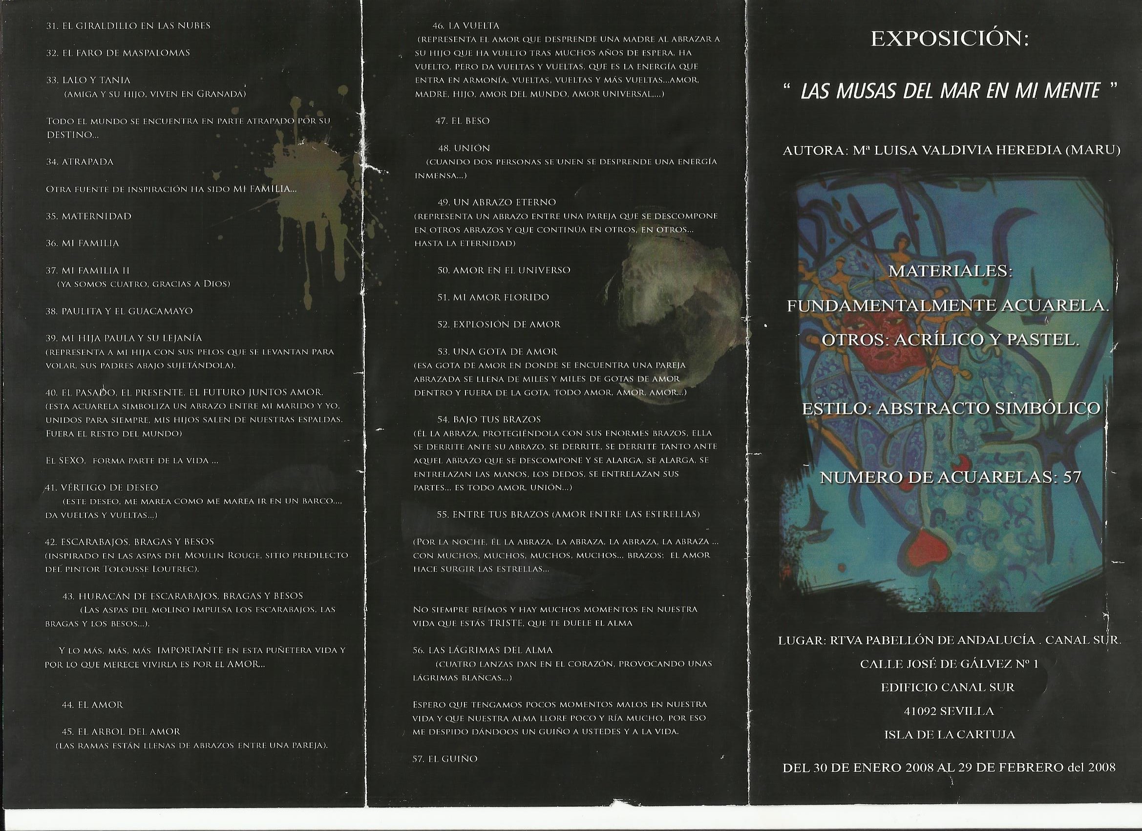 - Comentario: Aparte de la exposición conjunta de Villalba del Alcor donde me colgaron los cuadros, nunca más había expuesto y nunca había colgado ningún cuadro. Vinieron mis amigos (Miriam, Juan Casas y Mari) dos días antes a ayudarme y les dije tranquilamente que no me hacía falta. El día previo a la exposición, mi hermana Pepa me abrió los ojos y me preguntó: ¿Quién va a colgar los 57 cuadros que expones? y le contesté : pues,…, no sé…., no conocía la sala, no sabía qué método se podía usar para colgarlos, no tenía materiales…en fin, y yo tan tranquila, un desastre…Gracias que apareció Juanlu la tarde previa. Bendito Juanlu. ¡Compra tanzas y cáncamos!, me dijo.¿Qué es eso?, le pregunté. Sin parar y a toda mecha, yo clavando cáncamos y colocando tanzas (aurora venía de vez en cuando a ayudarnos) y Juanlu sudando la gota gorda colocando tanzas desde el techo, colgando cuadros, subiéndose y bajándose de la escalera mil veces y colocando las luces. Y para colmo le pedí que cada cuadro tenía que ir en orden riguroso según lo había preestablecido en el tríptico. Santo Juanlu. Sin Juanlu esta primera exposición individual no hubiera sido posible. Eternamente agradecida. Tras esta experiencia las siguientes fueron hiperprogramadas. De todas maneras fue una experiencia muy feliz e inolvidable.