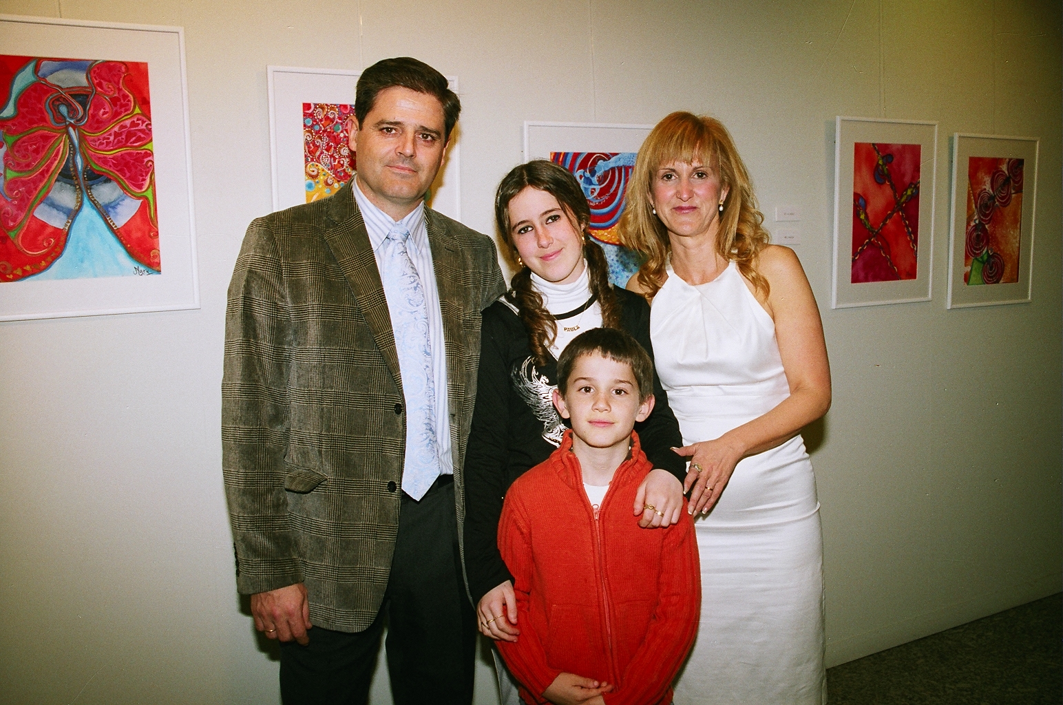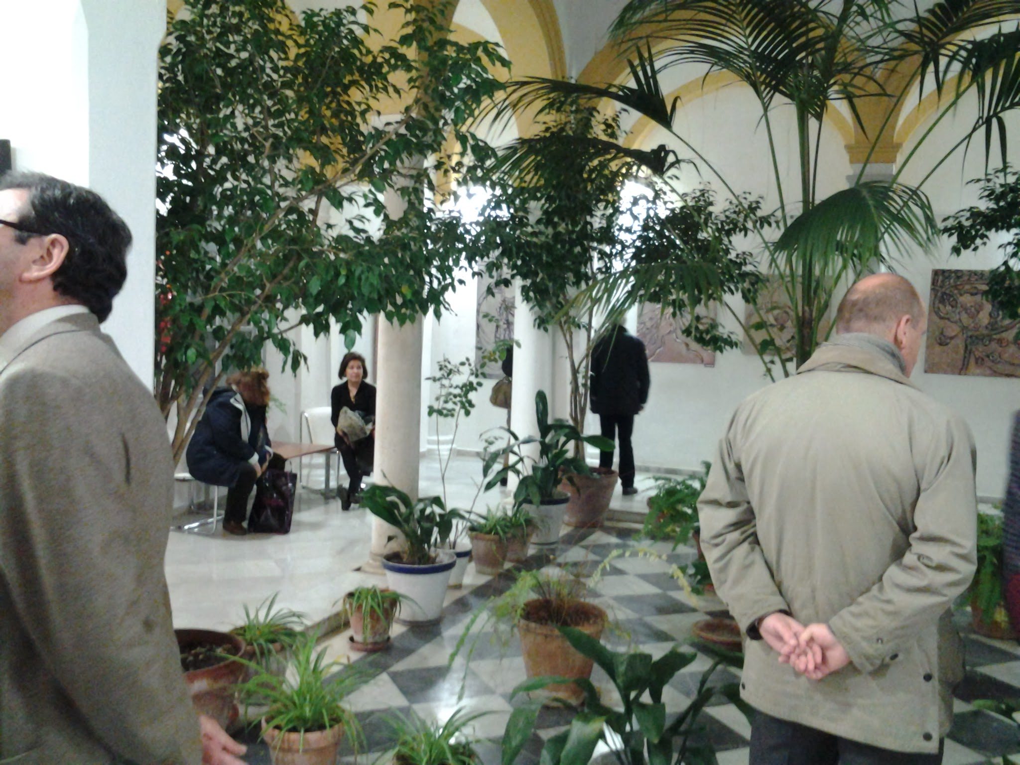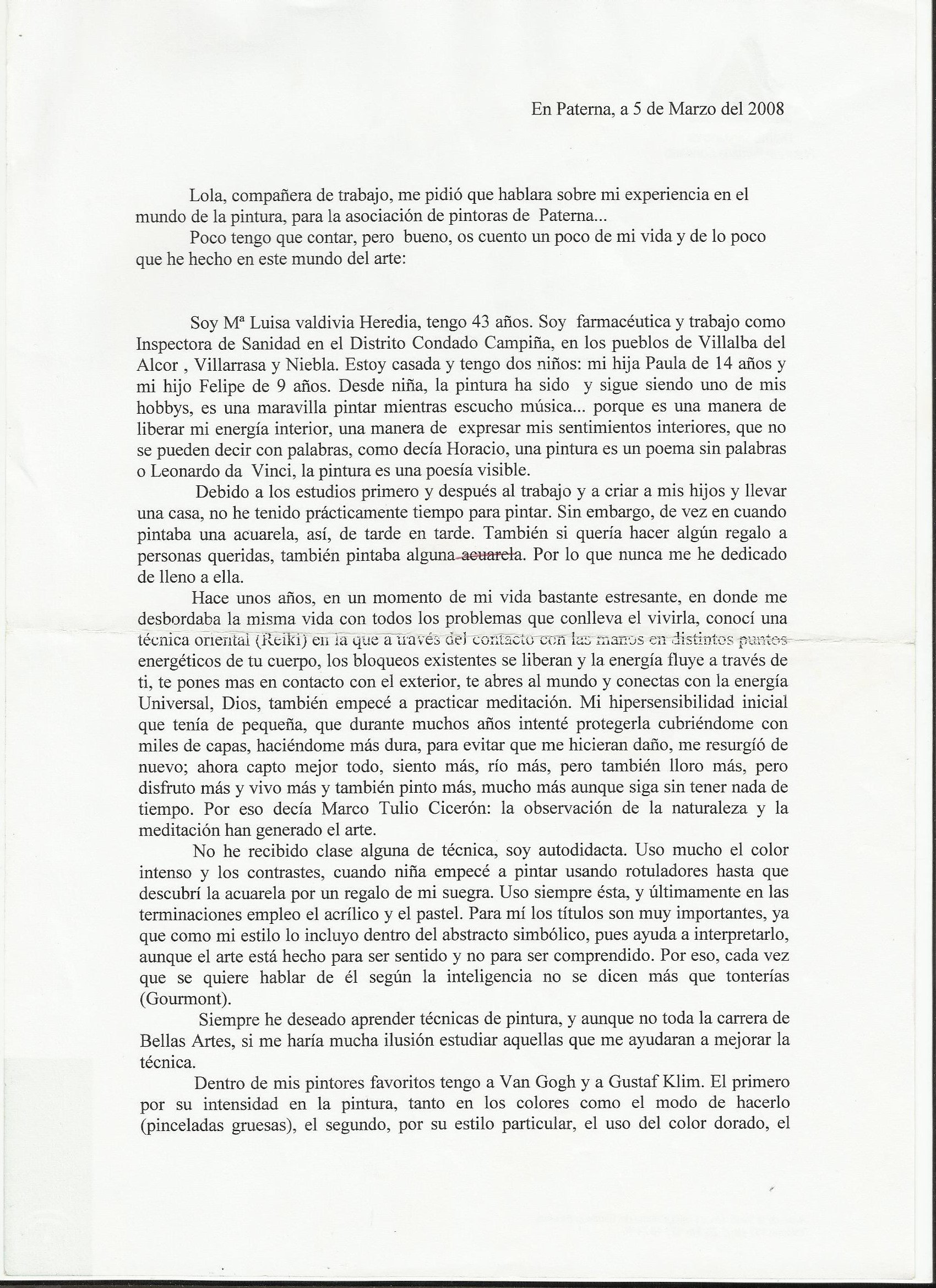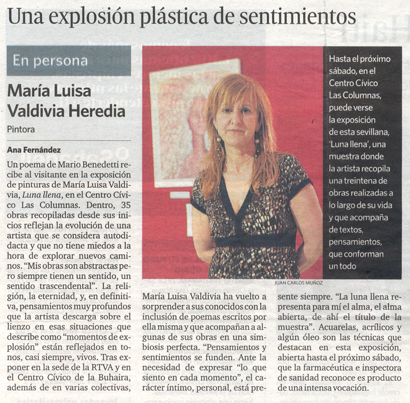 - Comentario: Aparte de la exposición conjunta de Villalba del Alcor donde me colgaron los cuadros, nunca más había expuesto y nunca había colgado ningún cuadro. Vinieron mis amigos (Miriam, Juan Casas y Mari) dos días antes a ayudarme y les dije tranquilamente que no me hacía falta. El día previo a la exposición, mi hermana Pepa me abrió los ojos y me preguntó: ¿Quién va a colgar los 57 cuadros que expones? y le contesté : pues,…, no sé…., no conocía la sala, no sabía qué método se podía usar para colgarlos, no tenía materiales…en fin, y yo tan tranquila, un desastre…Gracias que apareció Juanlu la tarde previa. Bendito Juanlu. ¡Compra tanzas y cáncamos!, me dijo.¿Qué es eso?, le pregunté. Sin parar y a toda mecha, yo clavando cáncamos y colocando tanzas (aurora venía de vez en cuando a ayudarnos) y Juanlu sudando la gota gorda colocando tanzas desde el techo, colgando cuadros, subiéndose y bajándose de la escalera mil veces y colocando las luces. Y para colmo le pedí que cada cuadro tenía que ir en orden riguroso según lo había preestablecido en el tríptico. Santo Juanlu. Sin Juanlu esta primera exposición individual no hubiera sido posible. Eternamente agradecida. Tras esta experiencia las siguientes fueron hiperprogramadas. De todas maneras fue una experiencia muy feliz e inolvidable.