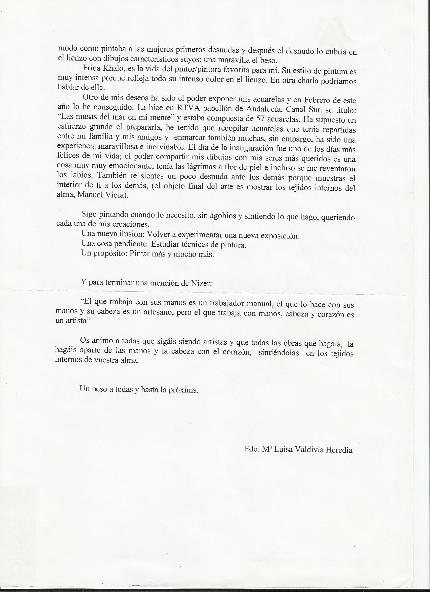 - Comentario: Eternamente agradecida a Flori, presidenta por esa fecha de la asociación Pinceladas, por el esfuerzo, interés y tesón que tuvo para que hiciera una exposición individual por encima de la negativa de la dirección del distrito y de algunas socias. Sin ella no hubiera sido posible realizarla.