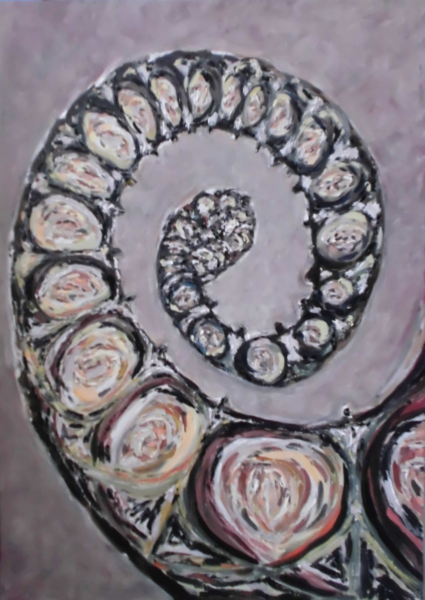 La pintura representa esta energía universal, todos los seres se unen por las manos y entrecruzan sus piernas, inician su espiral y a medida que crece la espiral, que crece la energía de Dios, se estira, lo espiritual se va separando de lo material. y se va engrandeciendo las rosas entre los seres, el cálamo que nos recorre se va alargando hasta llegar al infinito para ser solo energía con Dios. (*).